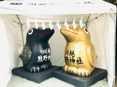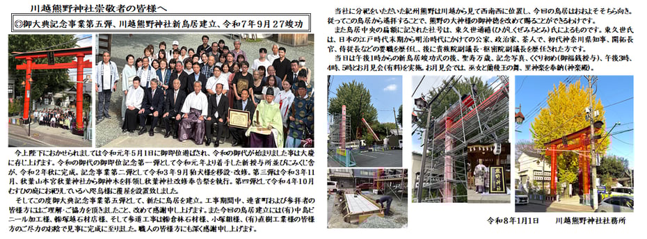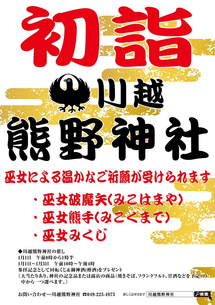川越熊野神社の御社紋で「導きの神 八咫烏様」。初代神武天皇が熊野の山中で道に迷われた時、無事奈良橿原宮までお導きになりました。