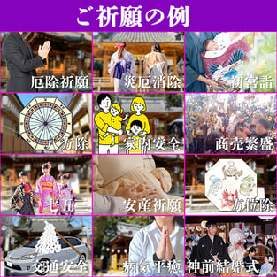 厄除祈願・災厄消除・初宮詣・七五三祈願・安産祈願・八方除祈願・方位除祈願・家内安全・商売繁盛・交通安全・病気平癒・神前結婚式・必勝祈願・社運隆昌・心願成就・身体健全・旅行安全・開運招福・良縁祈願・就職祈願・学業成就・合格祈願・十三詣り・成人祝・寿祭・報賽 その他諸祈願