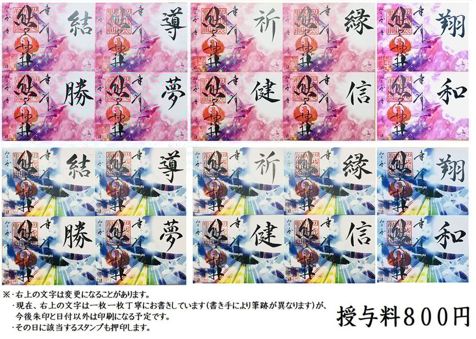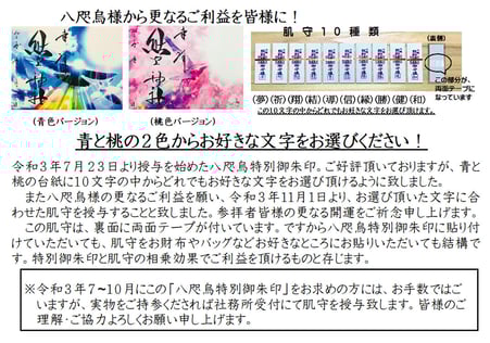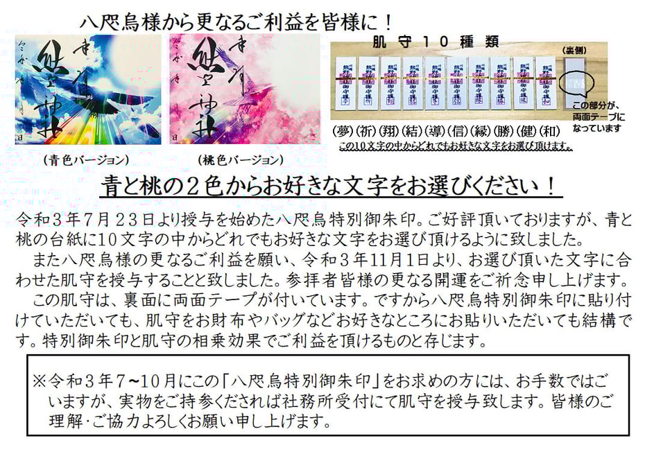 令和3年11月1日より「八咫烏特別御朱印」は、青・桃色2色の台紙とも10種の中からお好きな文字を選んでお頒かちするように致しました。さらに皆様の思いを八咫烏様に導いて頂けるようにそれぞれの文字に合わせた肌守をお付け致します。