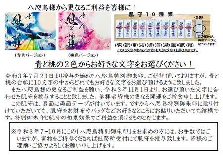 十二支揃えた方には、「大型御朱印帳」を進呈いたします。尚、その際はそれぞれの切り絵御朱印右下に八咫烏様の確認印を押させていただきますので、あらかじめご了承ください。